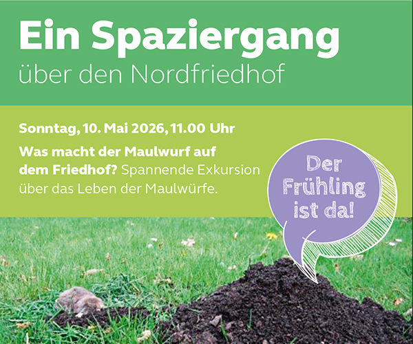 (Advertorial) Überall sieht man die braunen Erdhaufen auf den Feldern. Aber wer weiß schon etwas über den kleinen schwarzen Pelzträger, der sich täglich durch die dunklen Gänge unter der Erde wühlt und so manche Gartenbesitzer ärgert. Auch auf dem Nordfriedhof ist er zu Hause. Kinder sind mit ihren Eltern und Großeltern eingeladen, den Maulwurf näher kennen zu lernen.